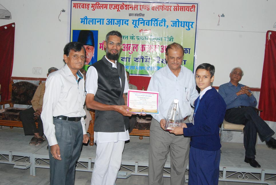 सोसायटी के अध्यक्ष एवं यूनिवर्सिटी चेयरपर्सन अब्दुल अजीज बैलिम ने कहा कि “मौलाना अबुल कलाम आजाद - तालीम से बदलती तकदीर” विषयक भाषण प्रतियोगिता, “मौलाना अबुल कलाम आजाद-बुलन्द हौंसलों से भरा एक कामयाब इन्सान” विषयक निबन्ध प्रतियोगिता तथा जनजागरूकता रैली आयोजित करने का मकसद छात्र-छात्राओं को आजाद की जि़न्दगी से रूबरू कराना हैं। प्रतियोगिता संयोजक एजे खान ने रिपोर्ट पेष करते हुए कहा कि “महात्मा गांधी जयन्ति से शुरू हुये सामुदायिक सद्भावना अभियान” के समापन एवं सम्मान समारोह में उर्दू, हिन्दी, अंग्रेजी भाषण प्रतियोगिता में माहरूख आरजू, अब्दुल मजीद, तरन्नुम, शाहीन, तबस्सुम मिर्जा, आदिल हुसैन व निबन्ध प्रतियोगिता में माहरूख आरजू, जिल्ले मोहम्म्द फारूकी, अब्दुल मजीद, शीतल एस. नायर, सोनू वैष्णव, सना, इलियास नागौरी, इमरान खान, सायमा गौरी, रामनिवास, हिना कौसर, तसलीम, भैरूलाल को क्रमषः प्रथम, द्वितीय व तृतीय स्थान के रूप मे मोमेन्टो एवं प्रमाण पत्र प्रदान किये गये।