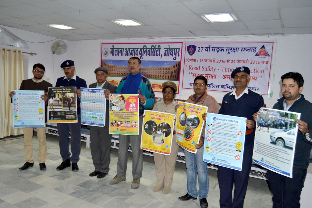 जोधपुर 22 जनवरी। कमला नेहरू नगर स्थित मौलाना आजाद यूनिवर्सिटी जोधपुर में यातायात पुलिस एवं परिवहन विभाग के संयुक्त तत्वावधान में 27वां सड़क सुरक्षाा सप्ताह के अन्तर्गत शुक्रवार को ‘यातायात शिक्षा एवं जागरूकता कार्यक्रम‘ आयोजित किया गया।