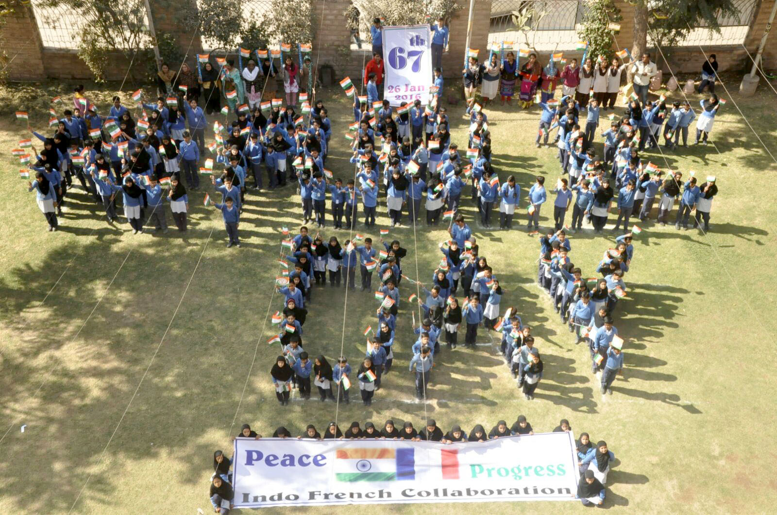 साथ ही विद्यार्थियों ने राजधानी दिल्ली में आयोजित होने वाले गणतंत्र दिवस के भव्य समारोह में बतौर मुख्य अतिथि पधार रहे फ्रांस के राष्ट्रपति फ्रांस्वा औलांद और विश्व को प्रतिकात्मक रूप से बैनर के माध्यम से ‘इंडो-फ्रेंच कोलोब्रेशन‘ (भारत-फ्रांस सहयोग) का संदेश दिया।