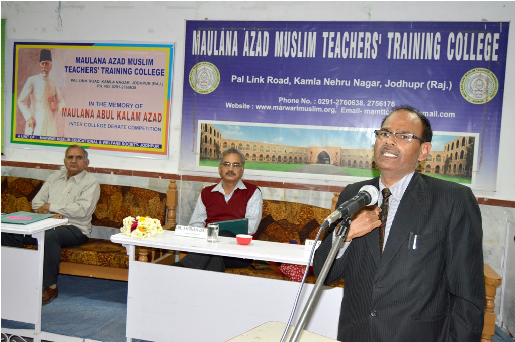 मौका था, देश के प्रथम शिक्षा मंत्री ‘मौलाना अबुल कलाम आजाद‘ की स्मृति में कमला नेहरू नगर स्थित मौलाना आज़ाद मुस्लिम टीचर्स ट्रैनिंग काॅलेज में शनिवार को आयोजित ‘परिवर्तित बी.एड़ पाठ्यक्रम की सार्थकता‘ विषयक अन्तर महाविद्यालय वाद-विवाद प्रतियोगिता का। प्रतियोगिता में प्रमिला विश्नोई, मोनिका छंगाणी, राजेन्द्र चारण, हरीश सुन्देशा, हिना बानो, हुक्माराम, इंसाफ अली, अशोक कुमार, खुमाराम, पिन्टू टाडा, महेन्द्र कुमार, सोमराज विश्नोई सहित समस्त प्रतिभागियों ने पक्ष-विपक्ष में अपने-अपने विचार रखें