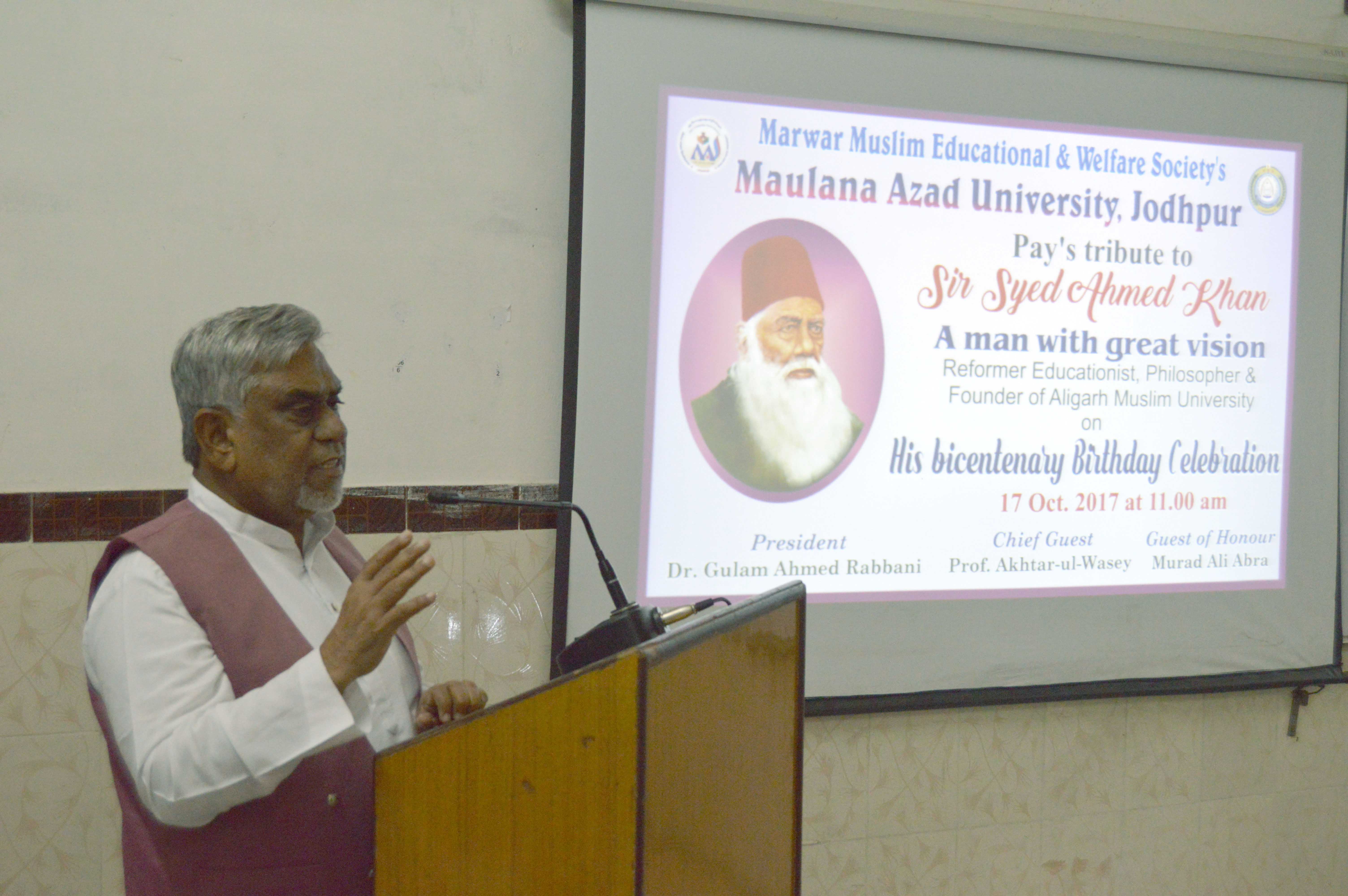 ये विचार मौलाना आज़ाद यूनिवर्सिटी के प्रेसिडेन्ट पद्म श्री अख्तरूल वासे ने बतौर मुख्य वक्ता मारवाड़ मुस्लिम एज्यूकेशनल एण्ड वेलफेयर सोसायटी की ओर से यूनिवर्सिटी सभागर में मंगलवार को ‘सर सैयद अहमद खान के 200वें‘ जन्मोत्सव के मौके पर आयोजित हुए सेमीनार में रखें। प्रोफेसर वासे ने कहा कि अलीगढ मुस्लिम यूनिवर्सिटी के संस्थापक सर सैयद की नज़र अतीत पर और उनकी पकड़ भविष्य पर थी।