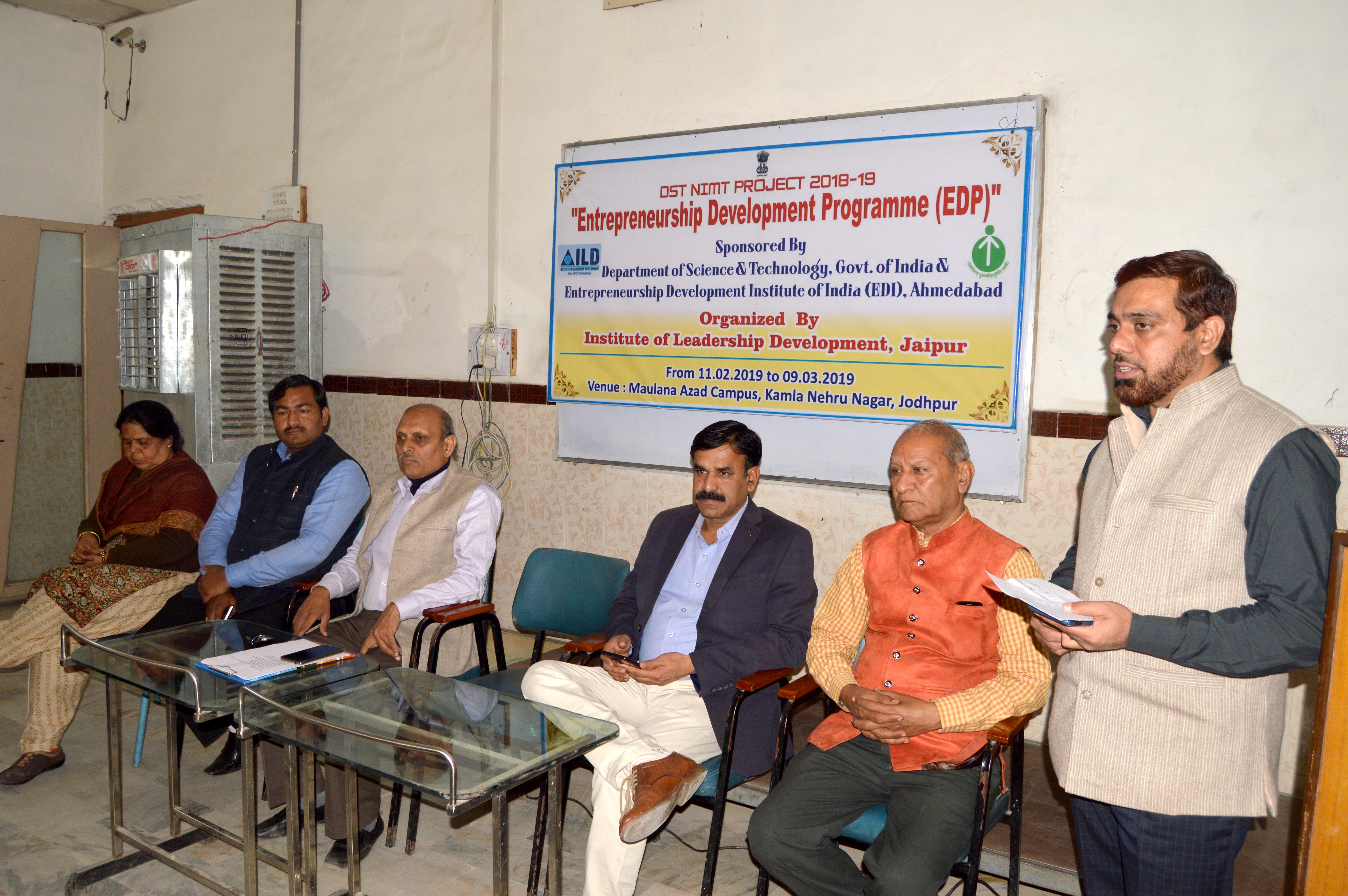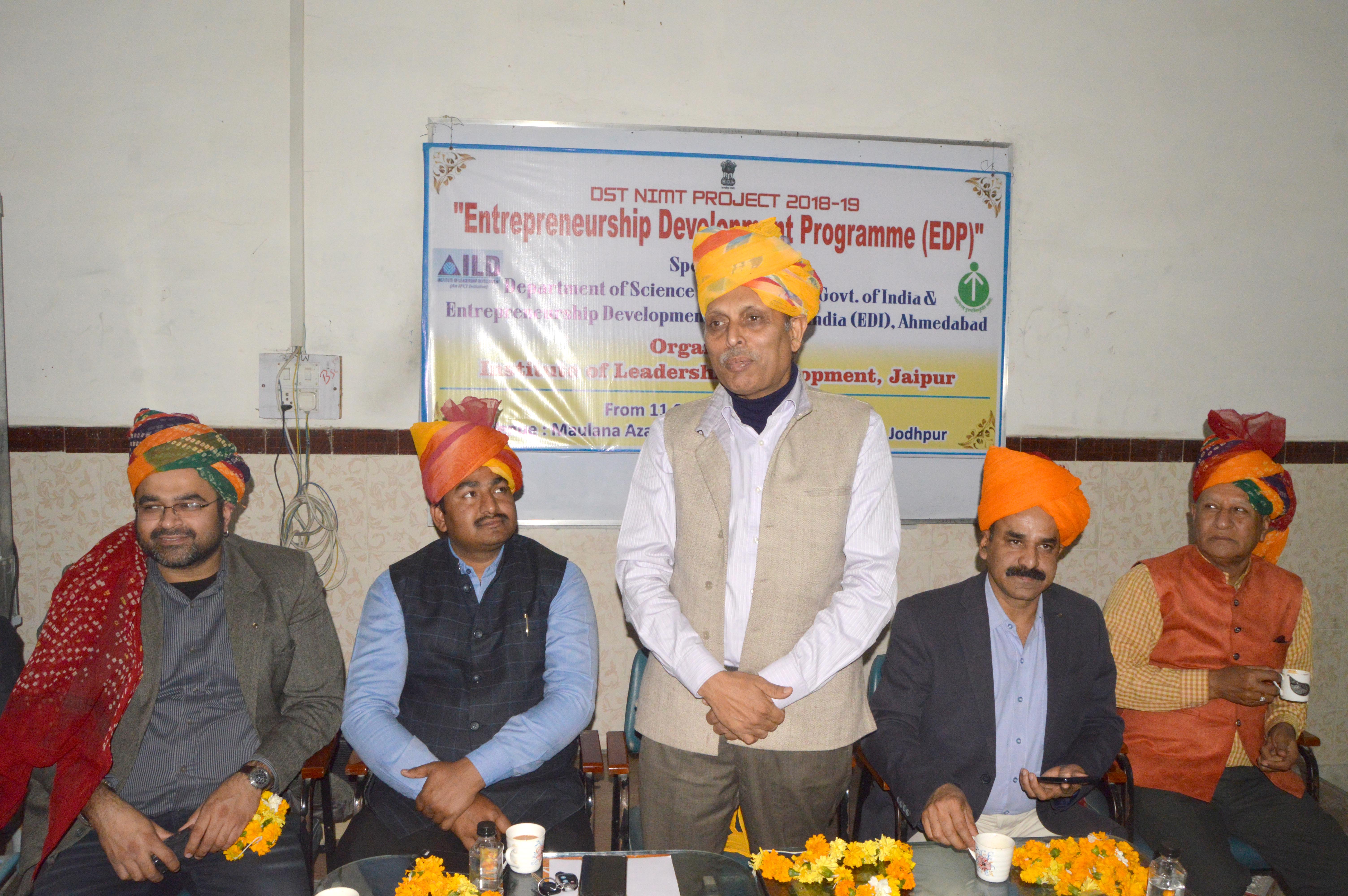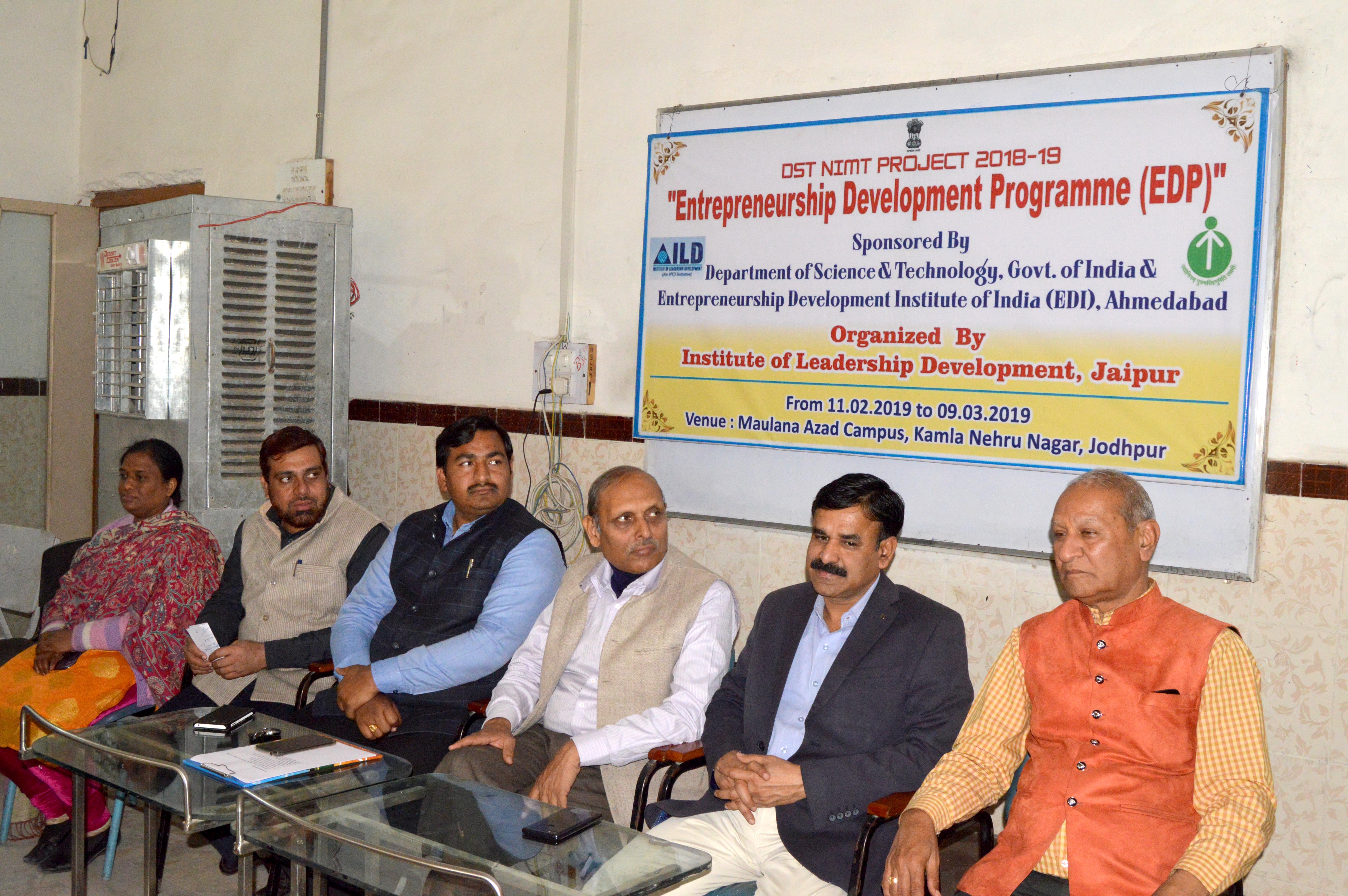जोधपुर 12 फरवरी। जोधपुर, विज्ञान व तकनीकी विभाग, भारत सरकार, उद्यमिता विकास संस्थान अहमदाबाद व नेतृत्व विकास संस्थान (आई.एल.डी.) जयपुर के संयुक्त तत्वाधान में उद्यमिता विकास प्रशिक्षण कार्यक्रम की शुरूआत सोमवार से कमला नेहरू नगर स्थित मौलाना आजाद परिसर में हुई।
