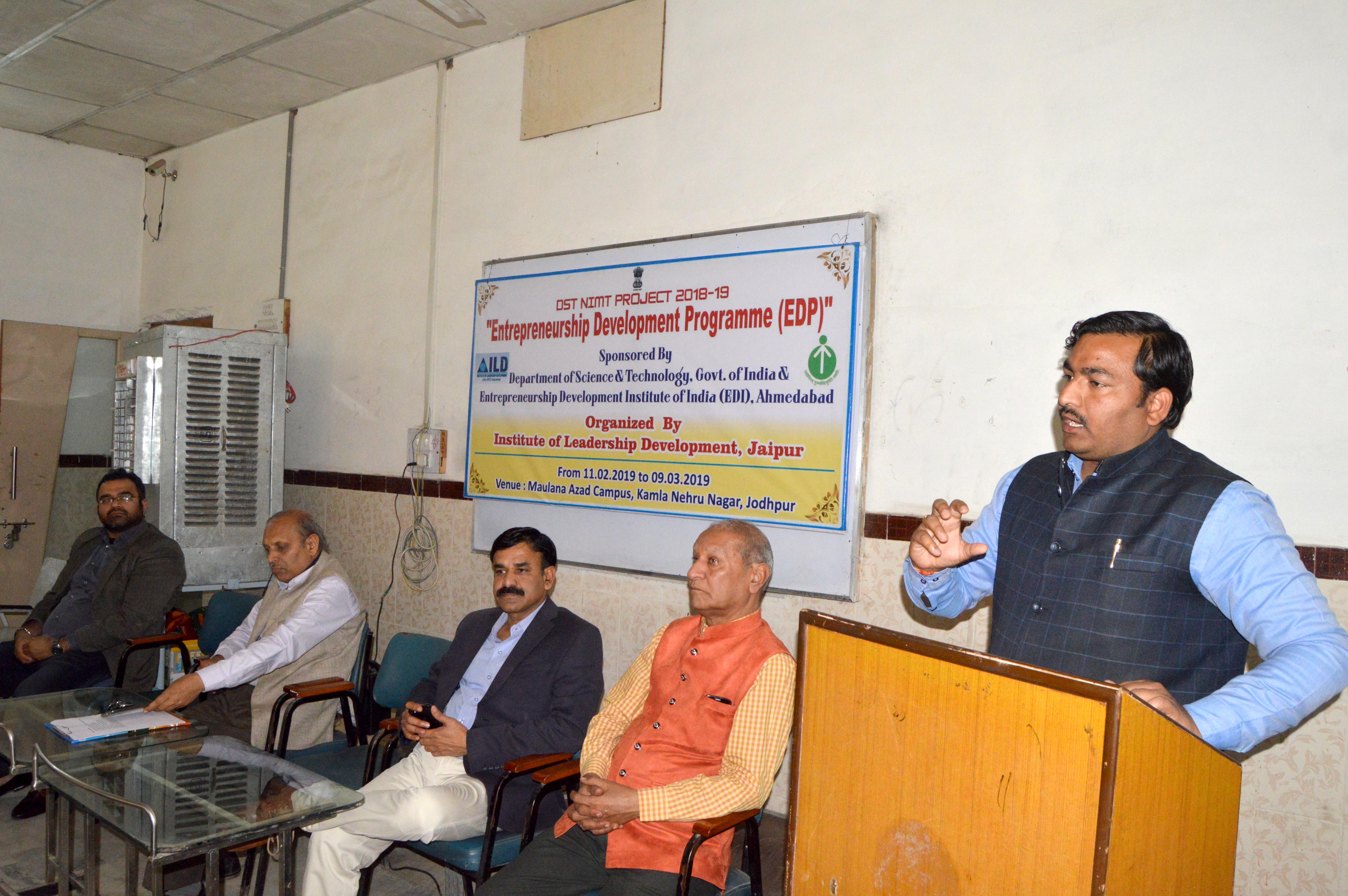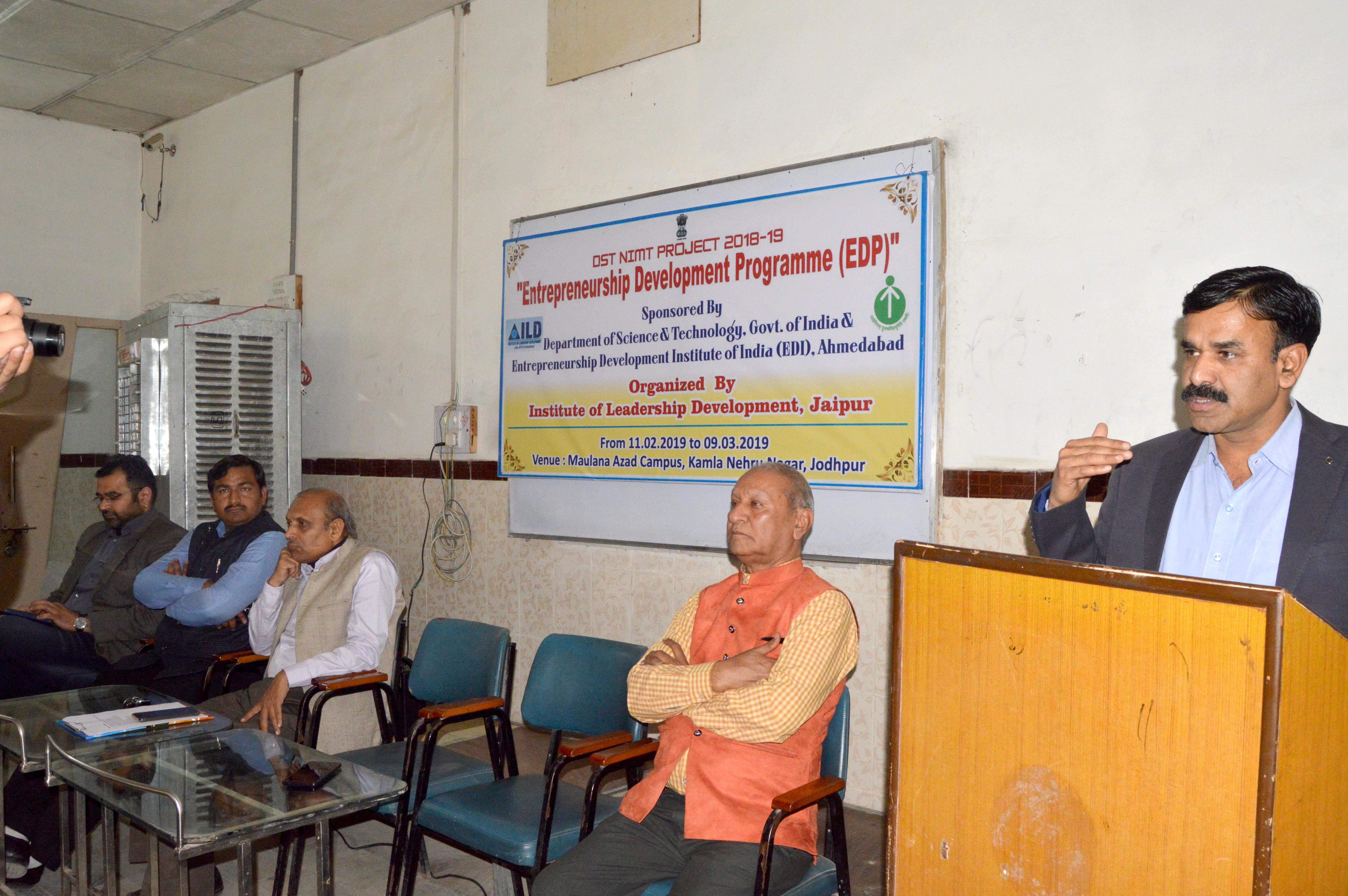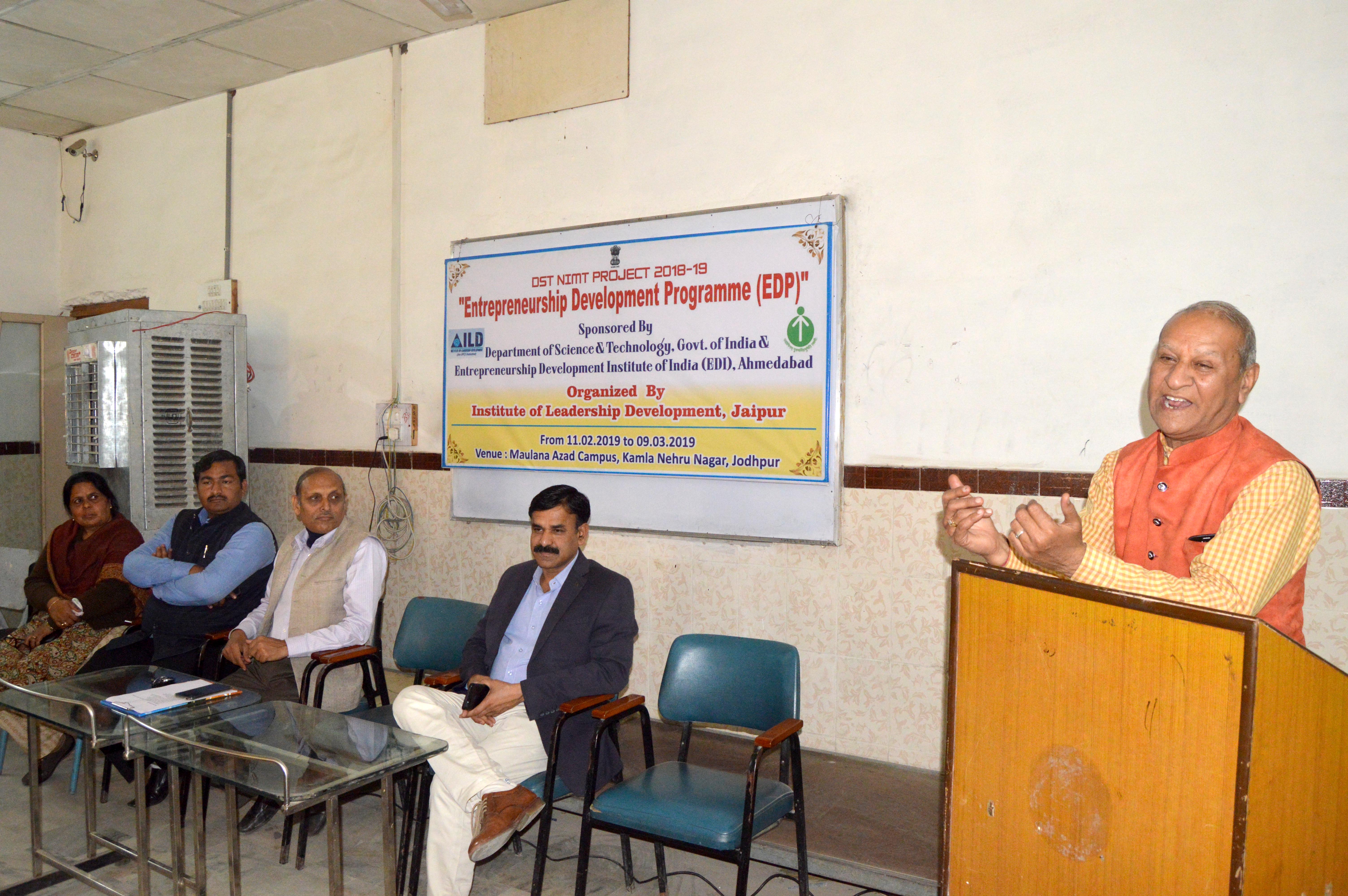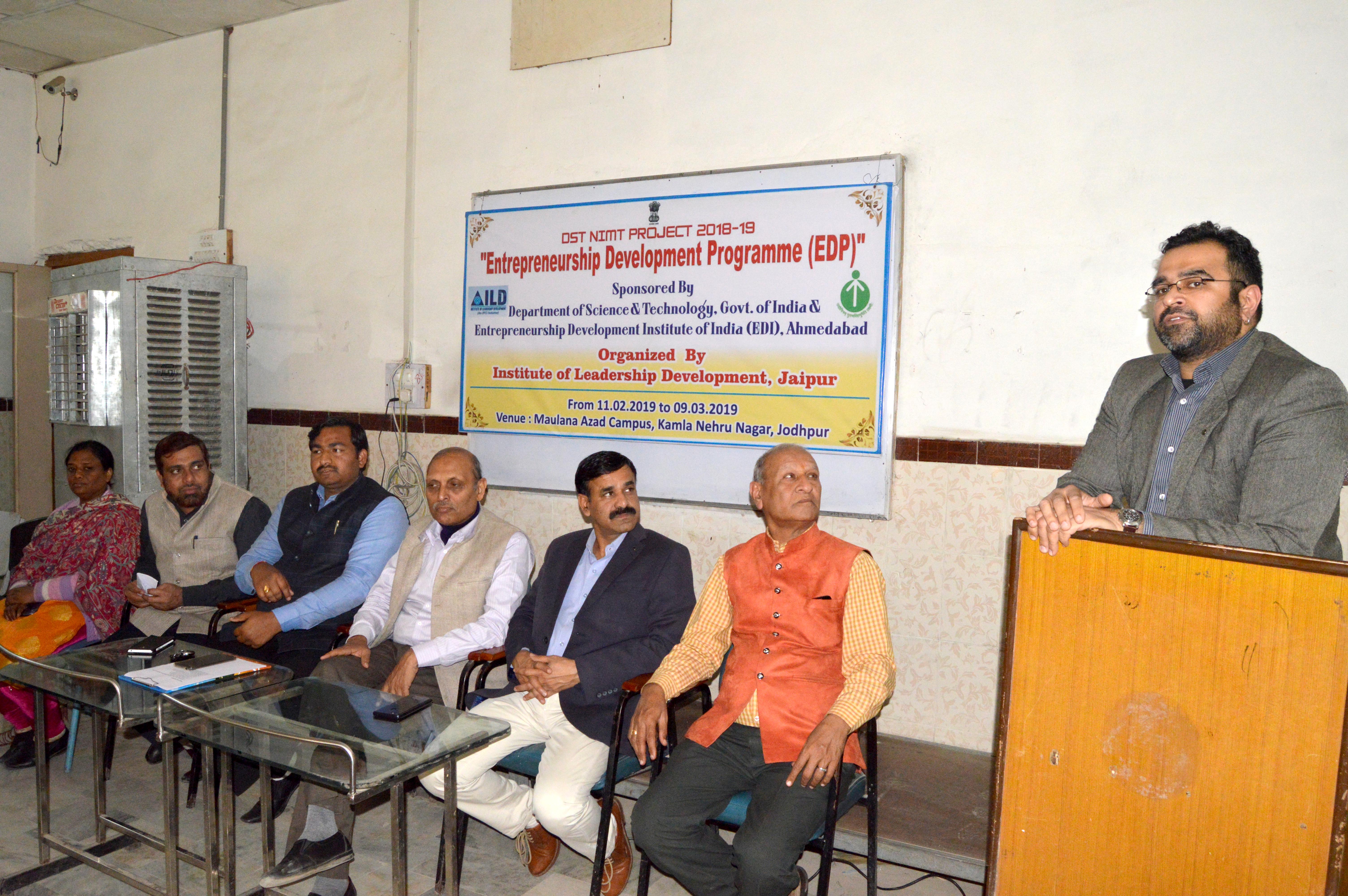 जोधपुर 12 फरवरी। जोधपुर, विज्ञान व तकनीकी विभाग, भारत सरकार, उद्यमिता विकास संस्थान अहमदाबाद व नेतृत्व विकास संस्थान (आई.एल.डी.) जयपुर के संयुक्त तत्वाधान में उद्यमिता विकास प्रशिक्षण कार्यक्रम की शुरूआत सोमवार से कमला नेहरू नगर स्थित मौलाना आजाद परिसर में हुई।