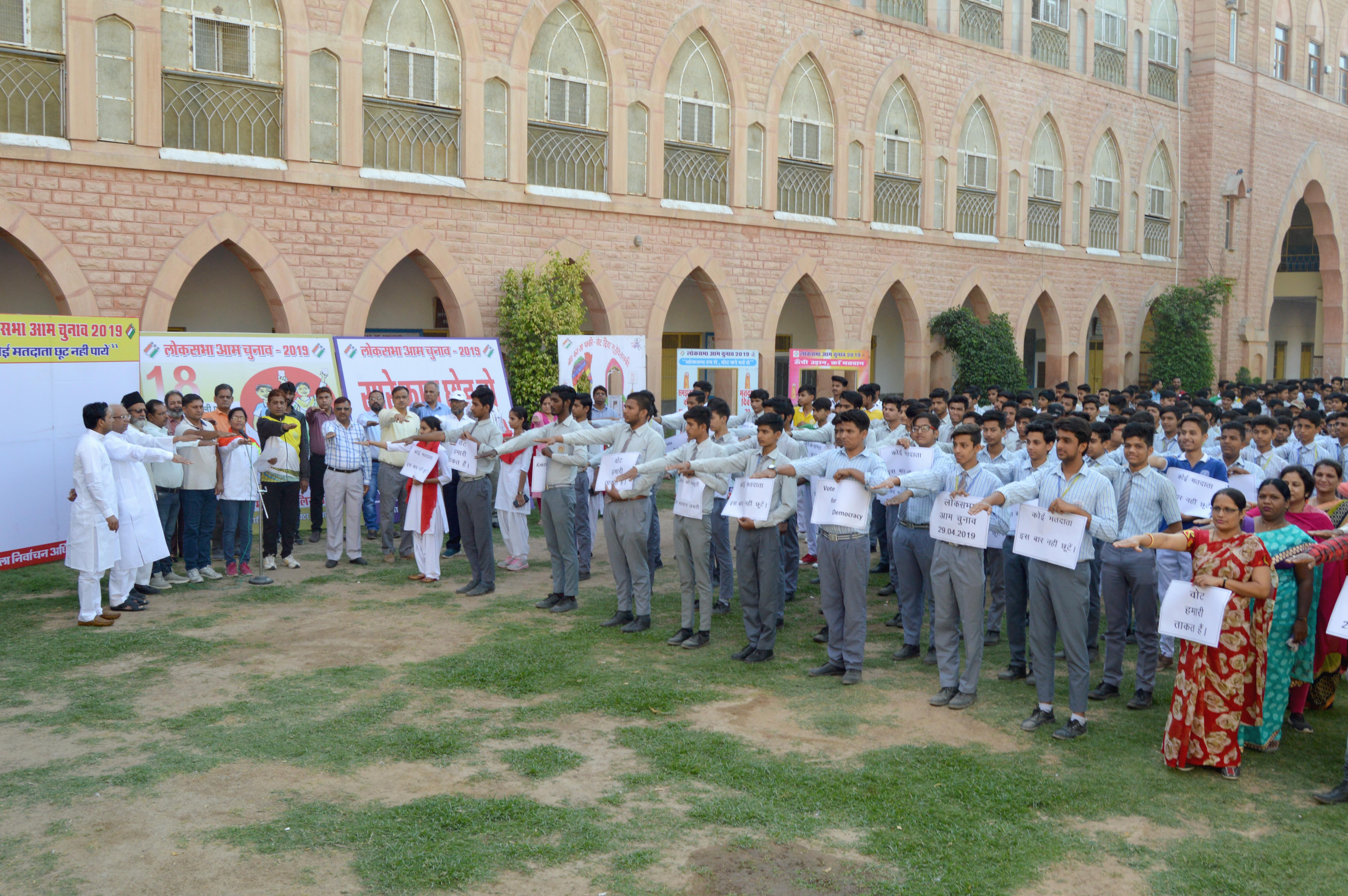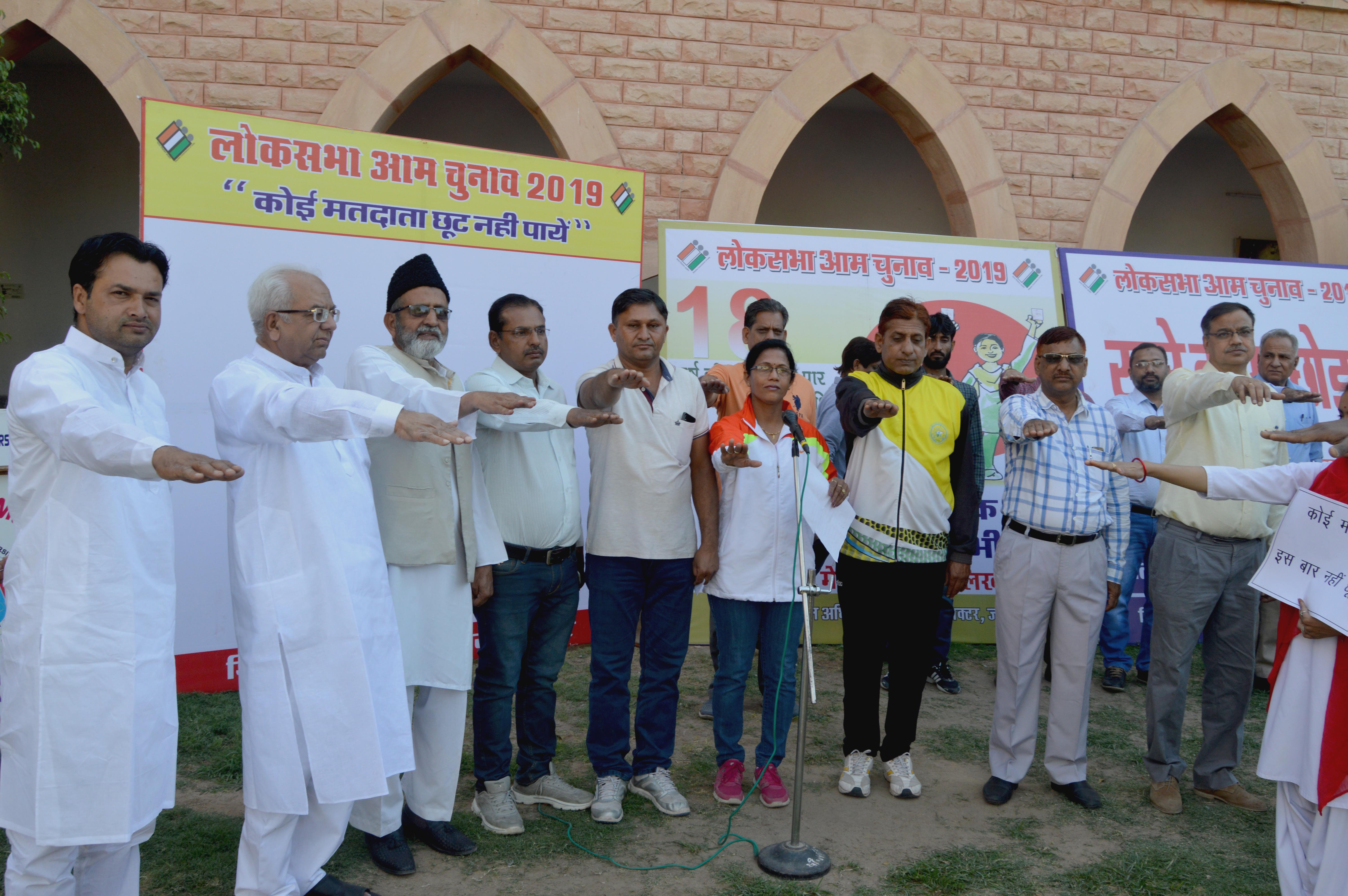 स्वीप कार्यक्रम के ब्रांड एम्बेसेडरों एवं मौलाना आजाद मुस्लिम बीएड काॅलेज व मौलाना आजाद मुस्लिम महिला बीएड काॅलेज के कैम्पस एम्बेसेडरों ने युवा मतदाताओं को सामुहिक रूप से प्रतिज्ञा दिलावाई की, ‘‘हम, भारत के नागरिक, लोकतंत्र में अपनी पूर्ण आस्था रखते हुए यह शपथ लेते है कि हम अपने देश की लोकतांत्रिक परम्पराओं की मर्यादा को बनाए रखेंगे तथा स्वतंत्र, निष्पक्ष एवं शांतिपूर्ण निर्वाचन की गरिमा को अक्षुण्ण रखते हुए, निर्भीक होकर धर्म, वर्ग, जाति, समुदाय, भाषा अथवा अन्य किसी भी प्रलोभन से प्रभावित हुए बिना सभी निर्वाचनों में अपने मताधिकार का प्रयोग करेंगे।’’