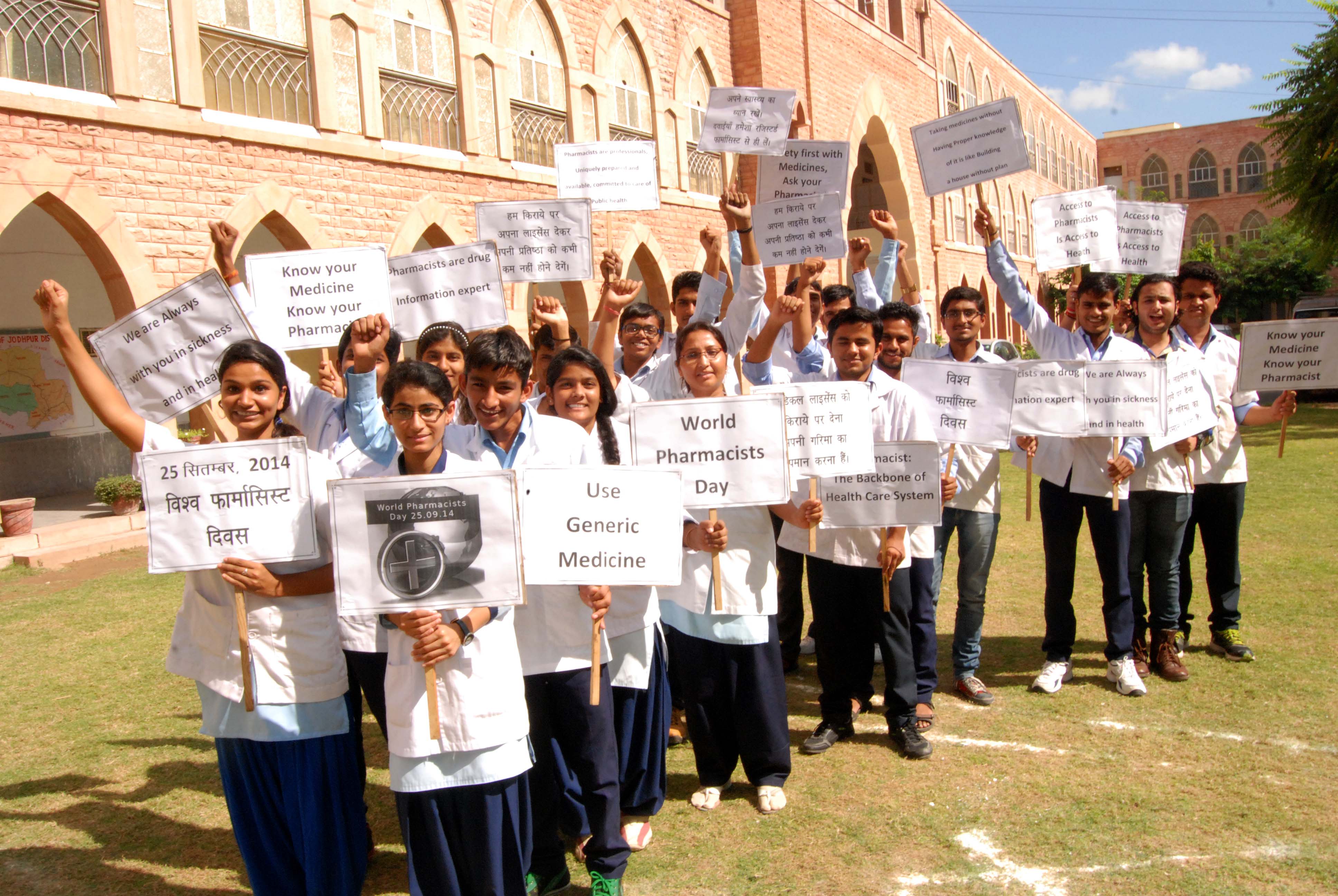 विश्व फॉर्मासिस्ट दिवस के अवसर पर गुरूवार को मौलाना आजाद इंस्टीट्यूट ऑफ फॉर्मेसी, जोधपुर के विद्यार्थियों ने फॉर्मेसी से जुड़ी बुनियादी नियमों की तख्तियां हाथों में थामकर, आमजन से ये अपील की, कि वें रजिस्टर्ड़ फॉर्मासिस्ट से ही दवाइयाँ खरीदें तथा रजिस्टर्ड फॉर्मासिस्टों से कहा कि वे अपना फॉर्मेसी लाइसेंस किसी को भी किराये पर नहीं दें।