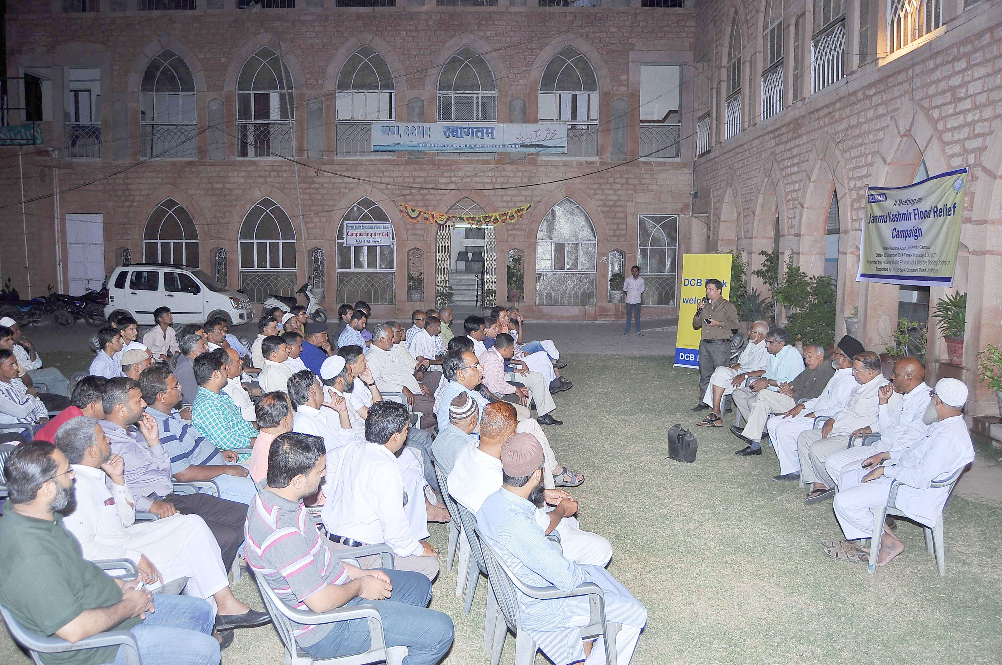 जम्मू-कश्मीर में शताब्दी की भीषणतम बाढ़ में मारे गये हज़ारों लोगों के परिजनों एवं पीडि़त लोगों की मदद के लिए कमला नेहरू नगर स्थित मुस्लिम स्कूल प्रांगण में डीसीबी बैंक जोधपुर एवं मारवाड़ मुस्लिम एज्यूकेशनल एण्ड वेलफेयर सोसायटी की संयुक्त तत्वावधान में बैठक आयोजित की गई।