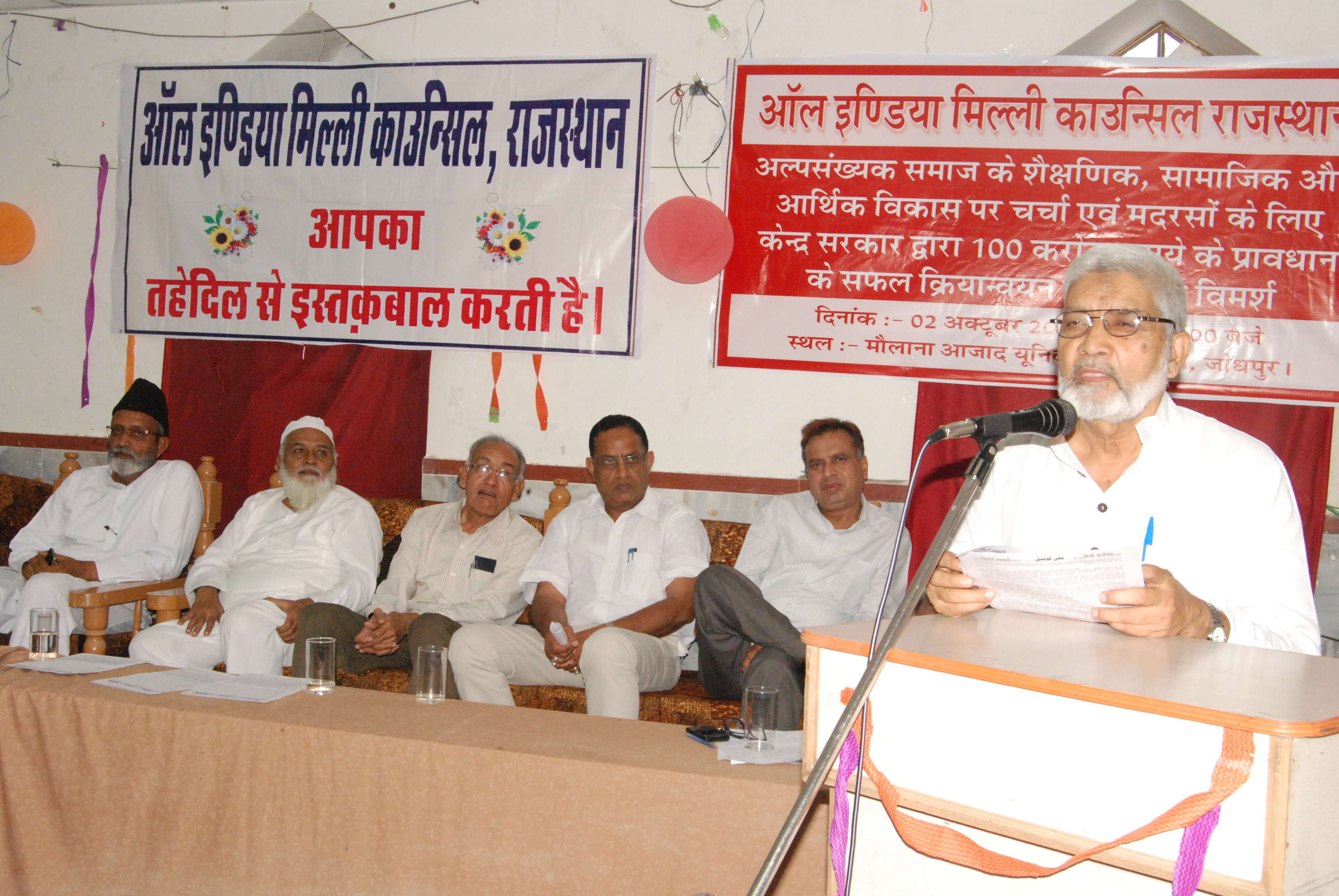 2 अक्टूबर गांधी जयन्ती के अवसर पर कमला नेहरू नगर स्थित मौलाना आजाद ऑडिटोरियम जोधपुर में गुरूवार को मिल्ली कौंसिल राजस्थान की अल्पसंख्यक समाज के शैक्षणिक, सामाजिक, आर्थिक विकास एवं मदरसों के लिए केन्द्र सरकार द्वारा 100 करोड़ के प्रावधान के सफल क्रियान्वयन के विषय चर्चा आयोजित की गई।