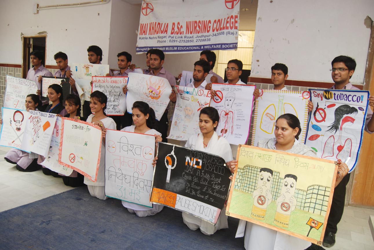 ऐसे ही जोशीलें नारों की तख्तियां हाथो में थामे मारवाड़ मुस्लिम एज्यूकेशनल एण्ड वेलफेयर सोसायटी के अधीन संचालित कमला नेहरू नगर स्थित, मांई खदीजा इन्स्टीट्यूट ऑफ नर्सिंग साईंसेज के विद्यार्थियों ने विष्व तम्बाकू निषेध दिवस के अवसर पर शुक्रवार को जनजागरूकता रैली निकाली। रैली को उपमहापौर न्याज मोहम्मद ने हरी झण्डी दिखाकर रवाना किया।