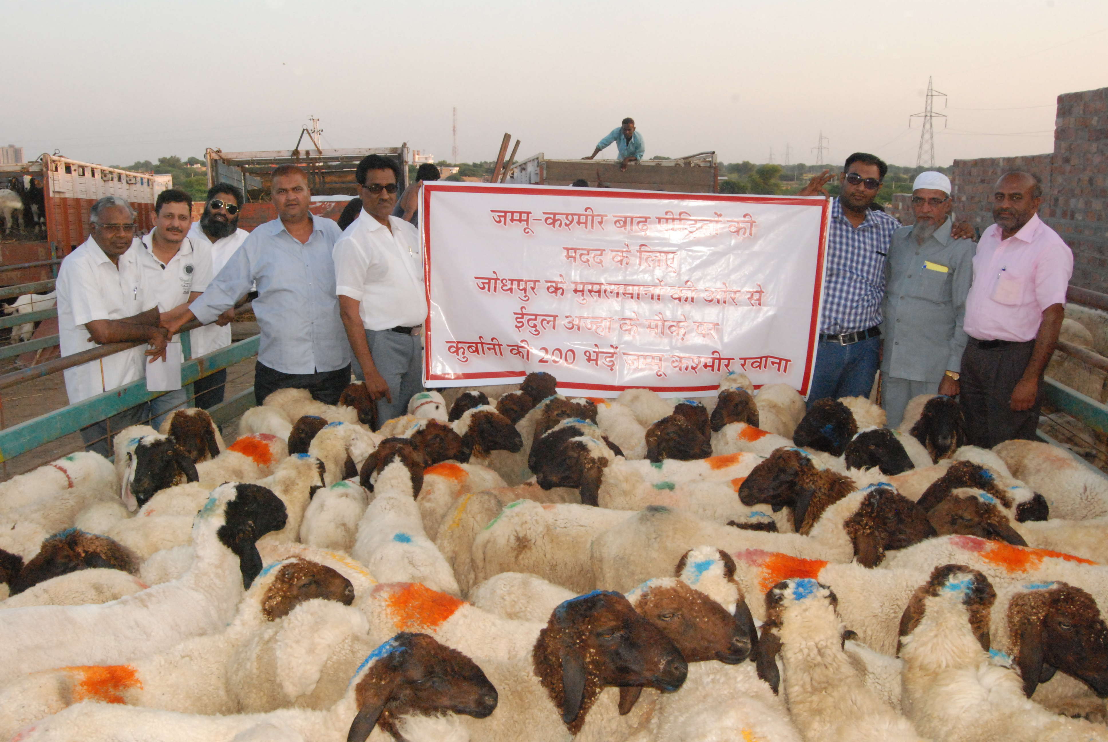 ईदुल अज्हा के नेक मौके पर जोधपुर के मुसलमानो की ओर से जम्मू कश्मीर बाढ हादसे में मारे गये लोगों के परिजनों एवं पीडि़त लोगों की मदद के मकसद से 200 भेडें कुरबानी के लिए सड़क परिवहन से रवाना की गई। मुस्लिम समाज के जिम्मेदार अबरार चुंदड़ीगर व अब्दुर्रहमान खिलजी ने जानकारी दी कि देश के कई जगहों से निजी स्तर पर कश्मीर पहुंच रही मदद की कड़ी में जोधपुरवासियो ने एक ओर नई पहल करते हुए अपनी इदुल अज्हा पर की जाने वाली कुरबानी को खुद के घर पर न करके वो कुरबानी जम्मू-कशमीरवासिायों के लिए देने का फैसला किया हैं।