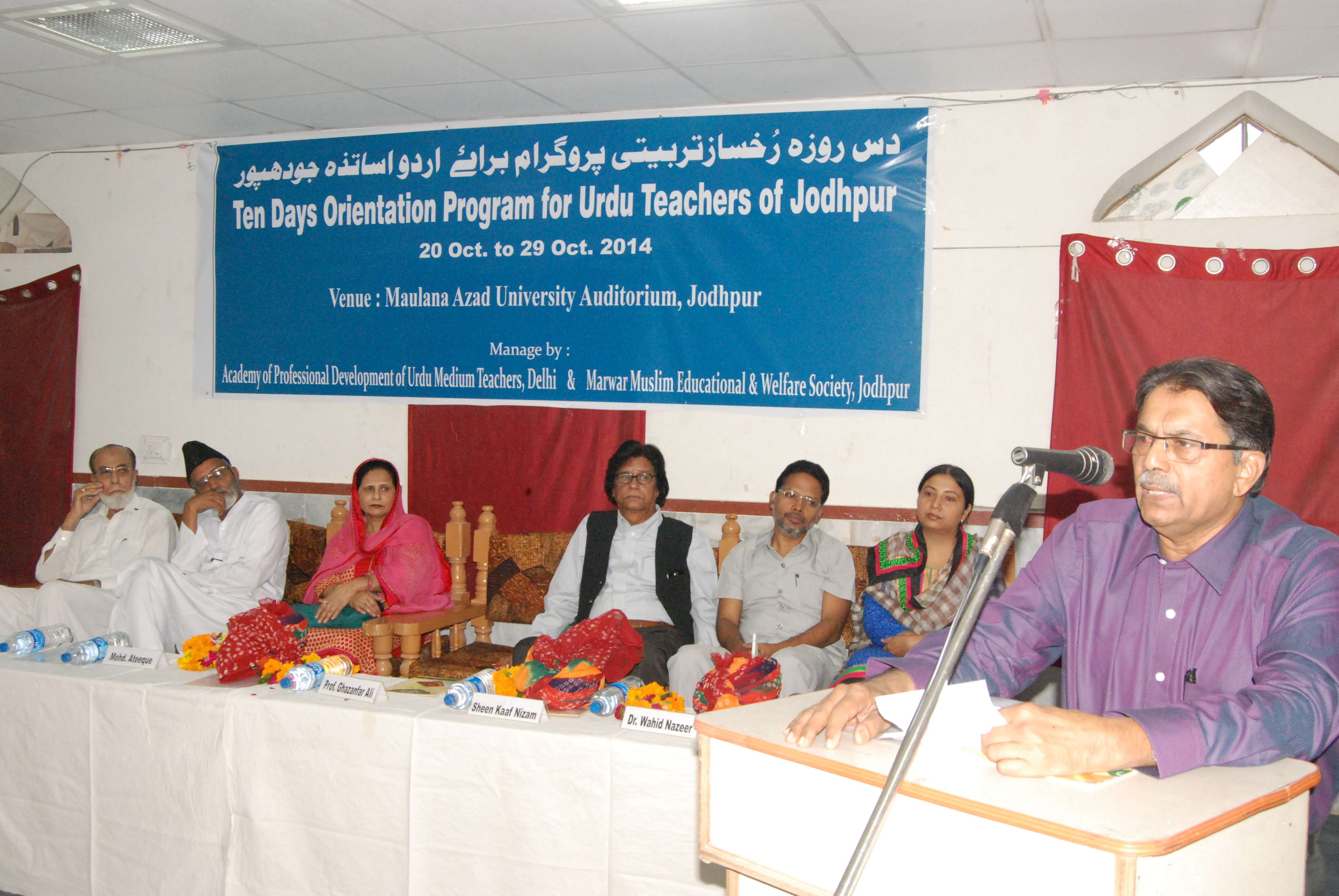 ये कहना हैं “एकेडमी ऑफ प्रोफेशनल डेवलपमेन्ट ऑफ उर्दू मीडियम टीचर्स जामिया मिल्लिया नई दिल्ली” के डायरेक्टर प्रोफेसर ग़ज़नफर अली का। जो जामिया मिल्लिया इस्लामिया नई दिल्ली एवं मारवाड़ मुस्लिम एज्यूकेशनल एण्ड वेलफेयर सोसायटी जोधपुर के संयुक्त तत्वावधान में “एकेडमी ऑफ प्रोफेशनल डेवलपमेन्ट ऑफ उर्दू मीडियम टीचर्स नई दिल्ली” की ओर से कमला नेहरू नगर स्थित मौलाना आजाद यूनिवर्सिटी के ऑडिटोरियम में सोमवार को आयोजित “दस दिवसीय उर्दू ओरियन्टेशन वर्कशॉप” के उद्घाटन समारोह में बतौर मुख्यअतिथि बोल रहे थे।